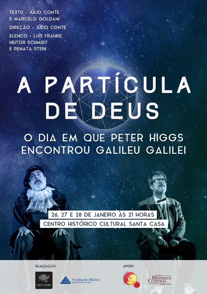Galileu Galilei, um dos maiores cientistas de todos os tempos, foi condenado pela Inquisição a renunciar as idéias heliocentristas, propostas por Nicolau Copérnico. Porém dizem que a encrenca com a Igreja ocorreu por ele ser um atomista. Galileu defendia que a matéria era composta por partículas indivisíveis e que entre elas havia o nada, a ausência de Deus.Peter Higgs, outro grande cientista, ganhou o prêmio Nobel de Física em 2012. Ele descreveu o bóson, uma partícula atômica que oferece massa às moléculas. Denominada a Partícula de Deus, ela ocupa o espaço entre uma partícula e outra. Esta peça construiu uma ponte no tempo entre estes dois grandes cientistas, e você está convidado a participar desse encontro histórico que nunca aconteceu e, por isso mesmo, tão promissor. A peça teve uma pré-estréia de duas sessões em outubro de 2016 no Salão de Atos da UFRGS e iniciou sua trajetória profissional no Porto Verão Alegre 2017 com um ótimo público. Nesse ano já cumpriu também uma temporada de 3 dias no Centro Histórico Cultural Santa Casa.